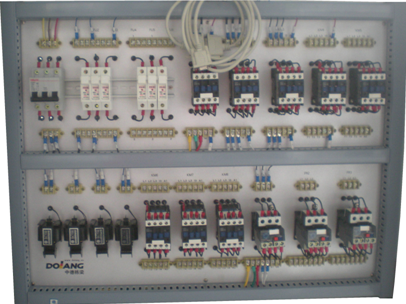 裝置實(shí)驗(yàn)柜正面為車床和銑床的機(jī)床電氣線路元器件布線區(qū)面板。背面是鉆床和磨床的機(jī)床電氣線路元器件布線區(qū)面板。面板上裝有低壓斷路器、直插式保險(xiǎn)絲、交流接觸器、熱繼電器、控制變壓器等元器件,這些元器件直接安裝在面板表面,可以很直觀的看它們的動(dòng)作情況,且都有相應(yīng)的測(cè)試點(diǎn),方便接線及故障考核檢測(cè)線路操作。