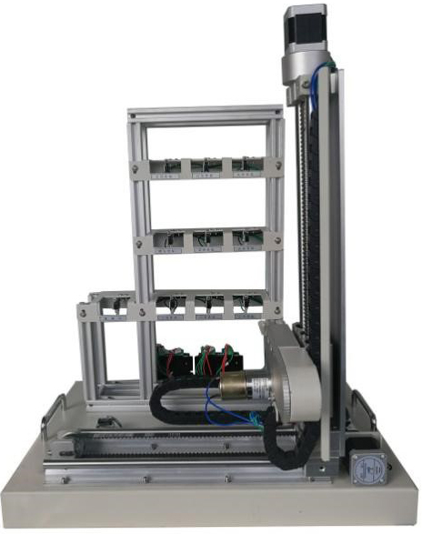 模型包含三層九倉位庫體、出/入庫倉位庫體、三維(X、Y、Z)運動機械及電氣控制等部分組成;定位執(zhí)行機構(gòu)由豎軸和橫軸組成;驅(qū)動機構(gòu)由步進(jìn)電機及步進(jìn)電機驅(qū)動器組成;傳動軸為滾珠絲桿傳動和雙軸導(dǎo)軌帶傳動,傳動平穩(wěn)。取物軸由直流減速電機驅(qū)動,可實現(xiàn)前后兩方向的運動。 |