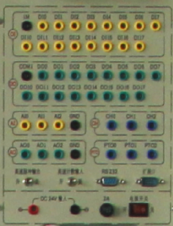 提供6路輸入、6路輸出等接口,輸入、輸出端電壓可自由切換0V和24V,輸出端由指示燈的亮滅來指示PLC輸出口的狀態(tài),面板印有清晰的說明和端口絲印。通過基本指令練習(xí),讓學(xué)生掌握PLC輸入、輸出的外圍接線和工作原理。