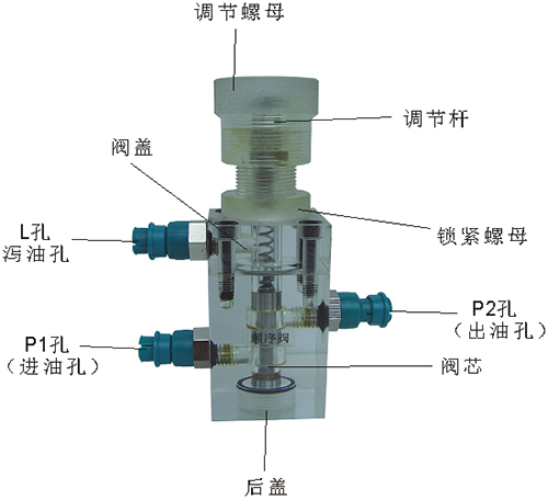 2、溢流閥結(jié)構(gòu)上參考了國產(chǎn)P-63B型低壓直動(dòng)式溢流閥,其閥體閥蓋、鎖緊螺母、調(diào)節(jié)螺母、螺塞等采用了進(jìn)口透明有機(jī)玻璃材料精制而成,閥芯、調(diào)節(jié)桿采用了45#中碳鋼材料。并配合彈簧,油接頭,密封圈等標(biāo)準(zhǔn)件裝配而成,通過它可明確地觀察到閥芯、彈簧、油孔等結(jié)構(gòu)及其運(yùn)行過程,具有形象逼真,性能可靠等優(yōu)點(diǎn)。它即可作為教學(xué)模型,也可以作為液壓實(shí)驗(yàn)元件進(jìn)行實(shí)驗(yàn)演示。