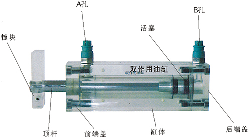 2、雙作用油缸的缸體,端蓋,行程撞塊,撞塊支承等均采用了進(jìn)口透明有機(jī)玻璃材料。頂桿采用了45#中碳鋼,并配合油接頭,密封圈,內(nèi)六角螺絲等標(biāo)準(zhǔn)件精制而成。能通過它明確地觀察活塞、頂桿、油封、油孔等結(jié)構(gòu)及其運(yùn)行過程。