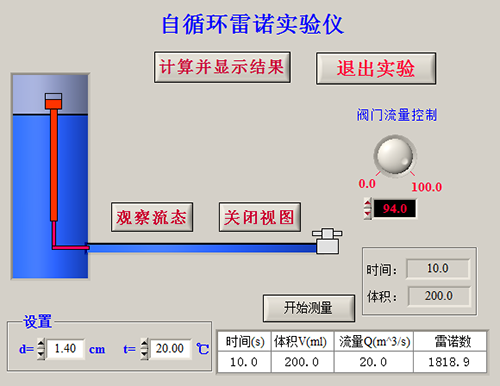 仿真演示軟件;能讓學生在電腦上更直觀地觀看模擬動態(tài)實驗,比如可以做成動畫軟件。移動式不銹鋼實驗臺、有機玻璃整流穩(wěn)壓水箱、雷諾管、顏料盒、顏料針管、計量箱、PVC板水箱、防腐潛水泵、循環(huán)管閥、7寸觸摸顯示屏、流量數(shù)顯裝置、控制箱、溫度傳感器DS18B20。